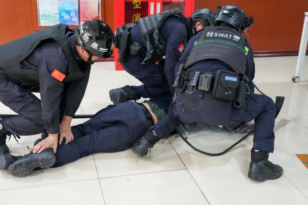 實(shí)戰(zhàn)模擬環(huán)節(jié)以“商業(yè)中心發(fā)生個(gè)人極端事件”為預(yù)設(shè)場(chǎng)景,全程模擬真實(shí)應(yīng)急處置流程。安保人員第一時(shí)間通過可視對(duì)講機(jī)報(bào)警,派出所指揮中心接報(bào)后,迅速開展應(yīng)急調(diào)度,指揮該商業(yè)中心的物業(yè)保安組成“最小應(yīng)急單元”,率先趕到現(xiàn)場(chǎng)展開先期處置。與此同時(shí),啟動(dòng)“就近互助”聯(lián)防機(jī)制——鄰近商圈、步行街的物業(yè)安保力量在接到指令后,快速攜帶裝備奔赴現(xiàn)場(chǎng)增援。巡特警大隊(duì)PTU則在最短時(shí)間內(nèi)抵達(dá),以專業(yè)的戰(zhàn)術(shù)素養(yǎng)與現(xiàn)場(chǎng)處置力量協(xié)同配合,高效穩(wěn)妥地處置了模擬警情。派出所民警同步完成接處警后續(xù)工作,實(shí)現(xiàn)了從報(bào)警到處置完畢的全流程閉環(huán)。整個(gè)處置過程緊張有序,有效檢驗(yàn)了最小應(yīng)急單元的快速反應(yīng)與協(xié)同作戰(zhàn)能力。