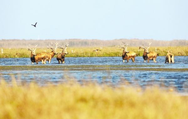 11月28日,在位于南洞庭湖區(qū)的沅江市,6只麋鹿在陳家湖的湖洲上覓食棲息。初冬的暖陽下,麋鹿與越冬候鳥和諧共處,構成一幅生動的生態(tài)畫卷。(鐘祖彪 黃曦 攝影報道)