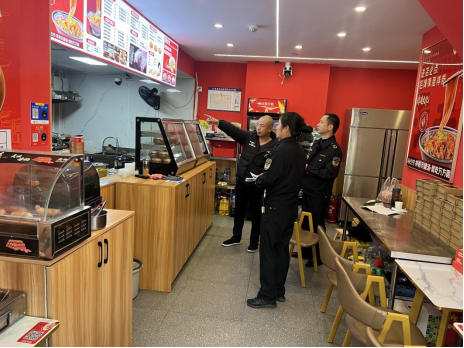 圖為執(zhí)法人員對(duì)商戶(hù)進(jìn)行指導(dǎo)