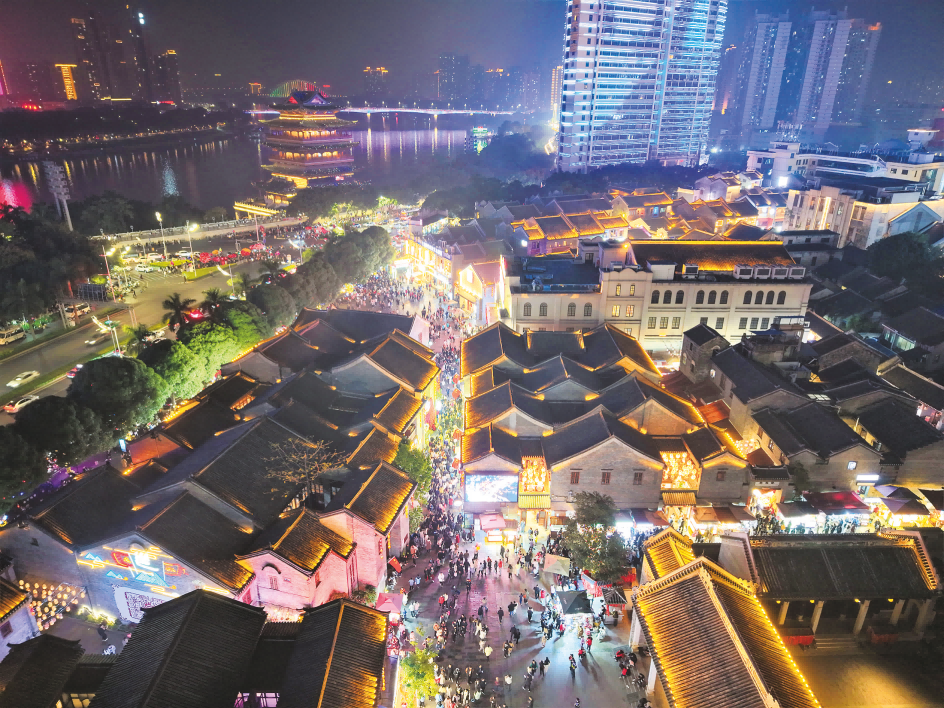 在邕州古城·三街兩巷歷史文化街區(qū)的青磚黛瓦間,文創(chuàng)市集與非遺工坊相互呼應;漓江書院內(nèi),游客在精心挑選國潮伴手禮;百年老店新華照相館仍在為人們定格時光;傳統(tǒng)小吃攤鋪前聚集著絡繹不絕的市民游客;“邕城印記”的老友粉制作、麼乜手工藝等互動項目吸引大量游客前來體驗;國風主題節(jié)會、夜間巡游、街頭演藝等演藝品牌豐富了文旅沉浸式消費體驗,夜間經(jīng)濟點亮邕江之濱。該街區(qū)成功入選首批國家級夜間文化和旅游消費集聚區(qū)、首批國家級旅游休閑街區(qū),越來越多的外地游客慕名到此,感受邕城文化的魅力。