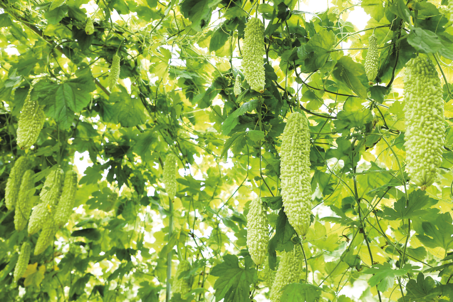 在興寧區(qū)五塘鎮(zhèn),一根根顏色翠綠、個頭飽滿的“五塘苦瓜”掛滿枝頭。(侯呈志 攝)