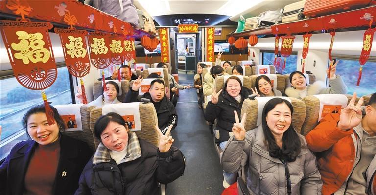 2月19日,務工旅客在G4840次務工定制高鐵專列上合影。王超攝(中經視覺)