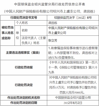 根據(jù)《中華人民共和國保險(xiǎn)法》第一百六十一條、《保險(xiǎn)公司管理規(guī)定》第六十九條,中國銀保監(jiān)會(huì)紹興監(jiān)管分局對(duì)中國人民財(cái)產(chǎn)保險(xiǎn)股份有限公司紹興市上虞支公司予以警告并處罰款人民幣15萬元,對(duì)龔邑棟予以警告并處罰款人民幣5000元。