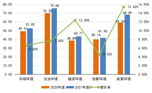 從五個(gè)一級(jí)指標(biāo)來看,各參評(píng)城市市場(chǎng)環(huán)境、法治環(huán)境、融資環(huán)境、創(chuàng)新環(huán)境和政策環(huán)境整體均有所改善,得分均值分別為52.80、75.68、43.71、41.95和68.49,分別比上次評(píng)估增長(zhǎng)6.65%、7.65%、12.40%、4.52%和15.42%。