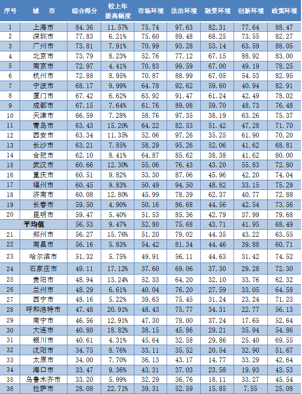 評(píng)估顯示,各參評(píng)城市政策環(huán)境和融資環(huán)境改善比較明顯,政策環(huán)境平均得分從59.34提升至68.49,其中,有24個(gè)城市上升超過10%;融資環(huán)境平均得分從38.89提升至43.71,其中,有22個(gè)城市上升超過10%。