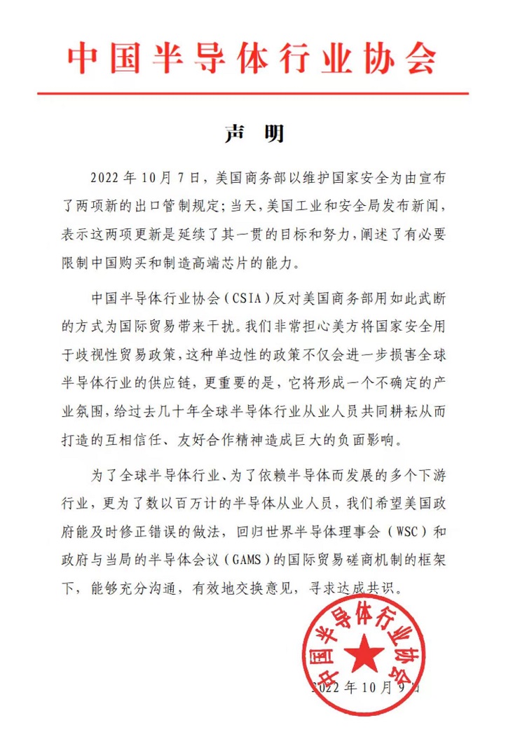 在聲明中,中國半導(dǎo)體行業(yè)協(xié)會指出,10月7日,美國工業(yè)和安全局發(fā)布新聞,表示這兩項出口管制規(guī)定更新是延續(xù)了其一貫的目標(biāo)和努力,闡述了有必要限制中國購買和制造高端芯片的能力。