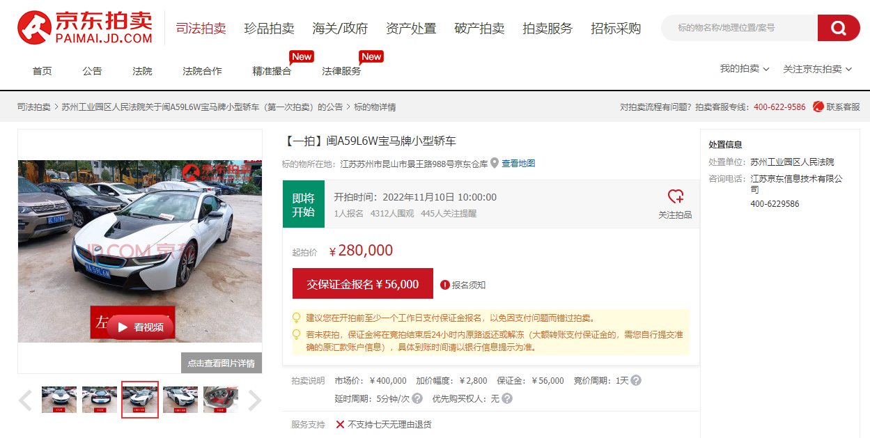 由蘇州工業(yè)園區(qū)法院處置的一臺2015年掛牌的寶馬i8,行駛里程約8萬公里,起拍價僅28萬元。寶馬i8在當年上市之初,號稱是唯一量產(chǎn)的概念車型,要重新定義城市移動出行方式,其超酷炫的外觀設(shè)計仿佛從未來穿越而來,博得一眾車友的喜愛。據(jù)了解,該臺車因融資租賃糾紛被法院查封拍賣,已吸引了4300余人的圍觀,花落誰家讓人期待。