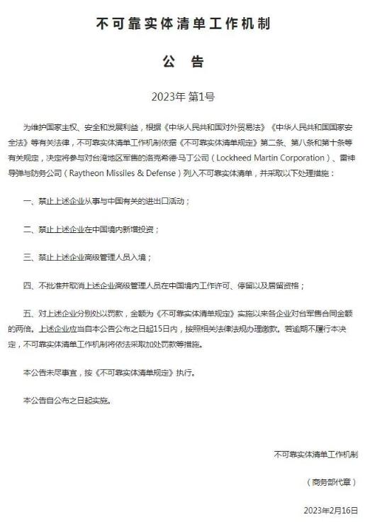 據(jù)商務(wù)部官網(wǎng)消息,2月16日,不可靠實(shí)體清單工作機(jī)制發(fā)布2023年第1號(hào)公告,決定將洛克希德·馬丁公司、雷神導(dǎo)彈與防務(wù)公司列入不可靠實(shí)體清單。