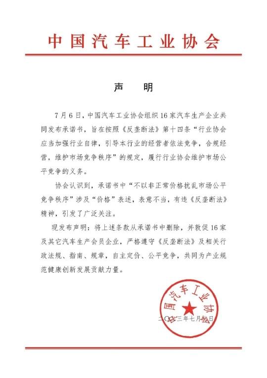 中國汽車工業(yè)協(xié)會表示,現(xiàn)發(fā)布聲明:將上述條款從承諾書中刪除,并敦促16家及其它汽車生產(chǎn)會員企業(yè),嚴格遵守《反壟斷法》及相關(guān)行政法規(guī)、指南、規(guī)章,自主定價、公平競爭,共同為產(chǎn)業(yè)規(guī)范健康創(chuàng)新發(fā)展貢獻力量。