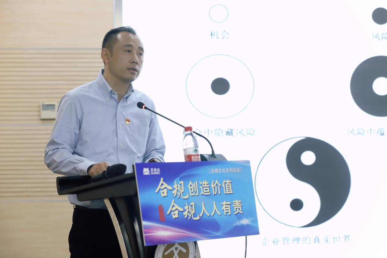 孫淼以《加強(qiáng)企業(yè)合規(guī)管理,推進(jìn)企業(yè)實現(xiàn)高質(zhì)量發(fā)展》為題,圍繞“什么是合規(guī)”“為什么要合規(guī)”“合規(guī)管理的發(fā)展”“合規(guī)管理的建議”四大部分,為與會人員作了輔導(dǎo)報告。對于蘇美達(dá)合規(guī)管理工作,他提出三點建議: