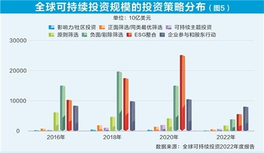 據(jù)全球可持續(xù)投資聯(lián)盟(GSIA)最新統(tǒng)計(jì),2022年企業(yè)參與和股東行動(dòng)策略投資規(guī)模占比達(dá)39.3%,較2020年提升約20.7個(gè)百分點(diǎn),逐漸成為ESG投資的主流策略。與此同時(shí),ESG整合策略及負(fù)面篩除策略的投資規(guī)模占比較2020年分別下降17.3個(gè)和7.8個(gè)百分點(diǎn)(圖5)。