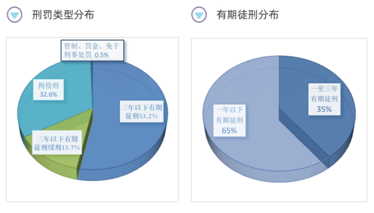 從輕罪案件的刑罰情況看,經(jīng)審判被判處三年以下有期徒刑實刑的6189人,占比53.2%;判處三年以下有期徒刑緩刑的1598人,占比13.7%;判處拘役刑的3796人,占比32.6%;判處管制、單處罰金和免予刑事處罰的60人,占比0.5%。此外,經(jīng)審判判處三年以下有期徒刑的人中,刑期在一年以下的5065人,占比達(dá)65%。