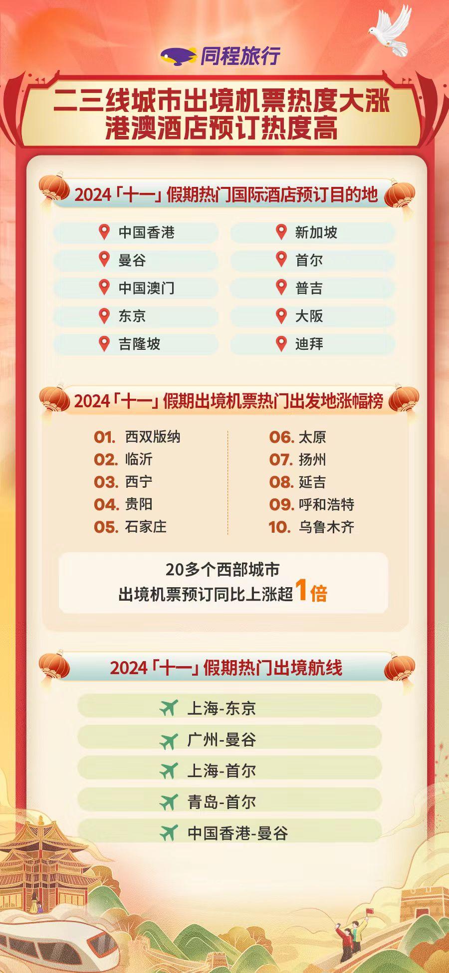 在客源地方面,國(guó)內(nèi)二三線城市居民特別是西部各省區(qū)市居民出境游需求快速增長(zhǎng)。同程旅行數(shù)據(jù)顯示,今年“十一”假期出境游機(jī)票出發(fā)地中,西雙版納、臨沂、西寧、貴陽(yáng)、石家莊等城市出境航班預(yù)訂熱度漲幅最高。有20多個(gè)西部城市出境機(jī)票預(yù)訂同比漲幅超過1倍。