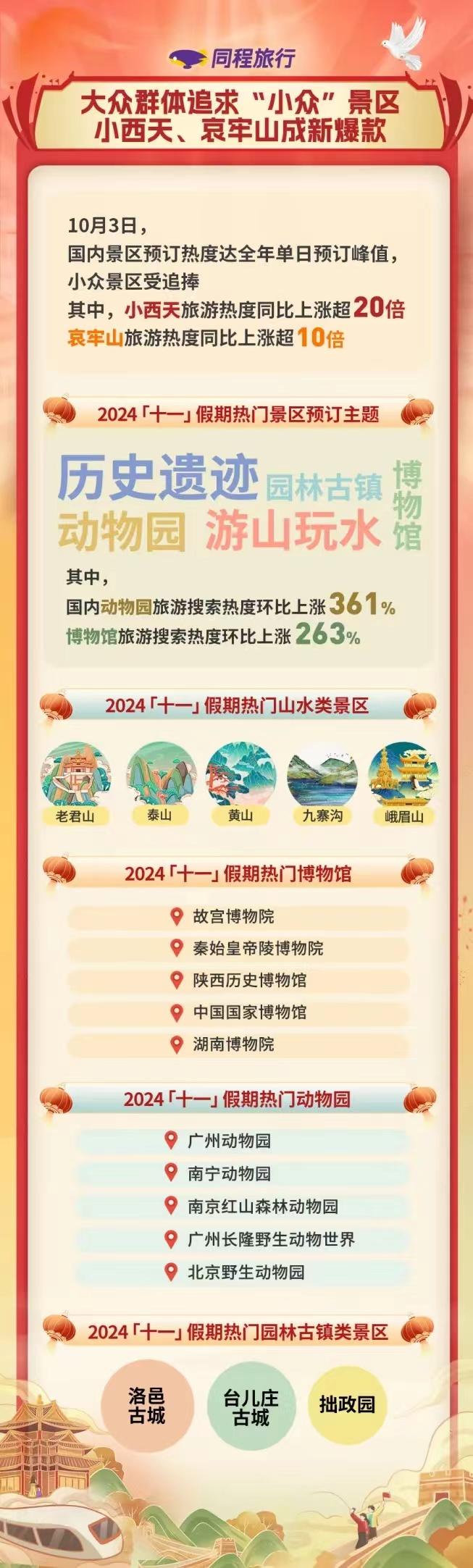 除了這些“小眾”景點(diǎn)外,歷史遺跡、自然山水、動(dòng)物園、博物館及園林古鎮(zhèn)是今年“十一”假期同程旅行平臺(tái)最受歡迎的景區(qū)主題。其中,國(guó)內(nèi)動(dòng)物園的旅游搜索熱度環(huán)比上漲361%,博物館旅游熱度環(huán)比上漲263%。