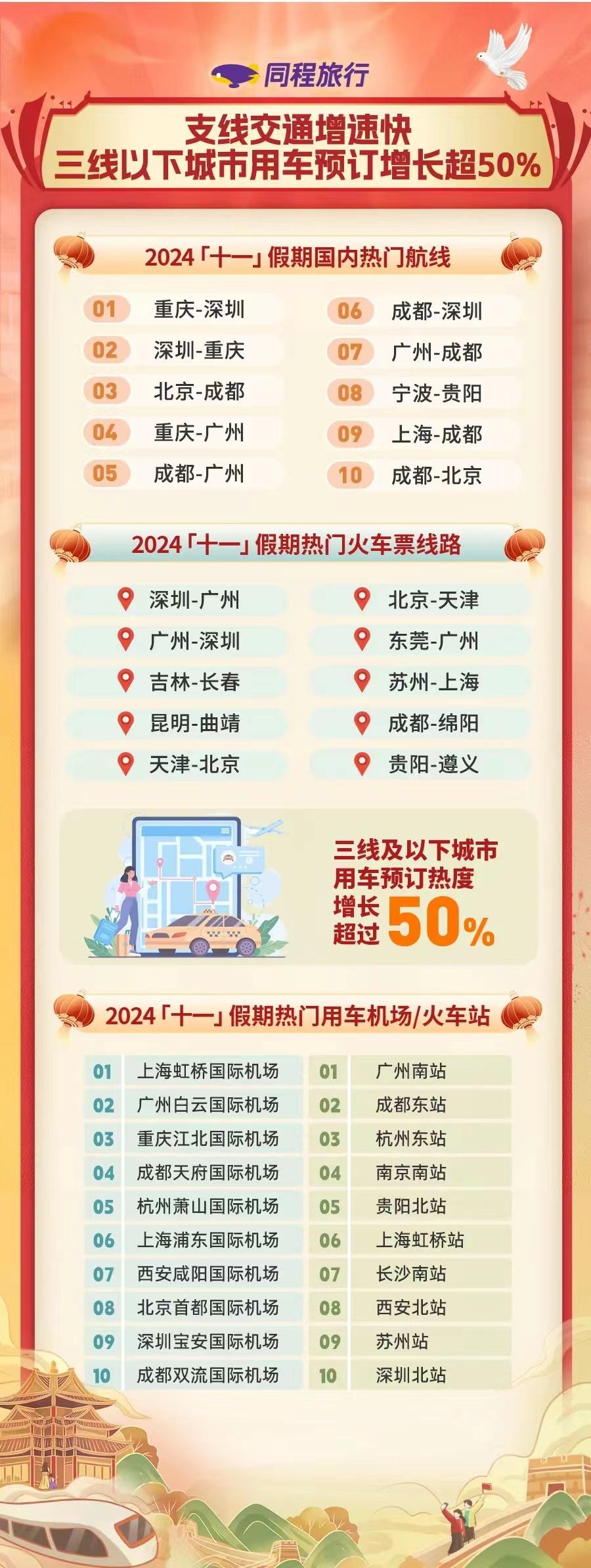 10月7日,同程旅行發(fā)布的《2024“十一”假期旅行消費(fèi)報(bào)告》顯示,2024年“十一”假期,國(guó)內(nèi)旅行消費(fèi)市場(chǎng)持續(xù)增長(zhǎng),二三線及以下城市居民出游消費(fèi)增長(zhǎng)迅速。同程旅行平臺(tái)上,三線及以下城市用車預(yù)訂熱度增長(zhǎng)超過50%;縣城文旅成假期消費(fèi)亮點(diǎn),全國(guó)近百個(gè)縣城酒店預(yù)訂熱度同比上漲超過50%。