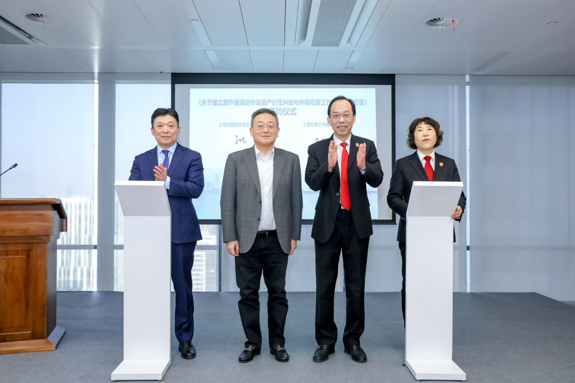 上海市國(guó)際貿(mào)易促進(jìn)委員會(huì)副會(huì)長(zhǎng)、上海國(guó)仲副主任馬屹和上海市第三中級(jí)人民法院副院長(zhǎng)俞秋瑋分別代表兩家單位簽署《備忘錄》,席建林院長(zhǎng)與周敏浩會(huì)長(zhǎng)共同見(jiàn)證。根據(jù)《備忘錄》的相關(guān)內(nèi)容,雙方未來(lái)將就庭外重組協(xié)作、破產(chǎn)衍生糾紛仲裁銜接等事宜開(kāi)展合作,在制度設(shè)計(jì)、成本優(yōu)化等方面探索有效的訴仲協(xié)同機(jī)制,提高破產(chǎn)衍生糾紛的審理效率與專(zhuān)業(yè)度,提升上海法律服務(wù)機(jī)構(gòu)的品牌影響力。