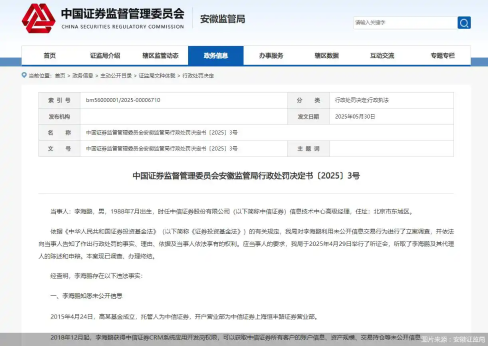 5月30日,安徽證監(jiān)局發(fā)布公告指出,時任中信證券信息技術(shù)中心高級經(jīng)理李海鵬存在違法行為,其獲得中信證券CRM系統(tǒng)應(yīng)用開發(fā)崗權(quán)限,可以獲取中信證券所有客戶的賬戶信息、資產(chǎn)規(guī)模、交易持倉等未公開信息。2019年11月1日至2023年2月21日,李海鵬通過CRM系統(tǒng),獲知高某基金的持倉、委托、當(dāng)日成交記錄等未公開信息,其利用未公開信息違規(guī)交易股票,同時存在趨同交易的情況。安徽證監(jiān)局決定,沒收李海鵬違法所得213.14萬元,并處以213.14萬元罰款。