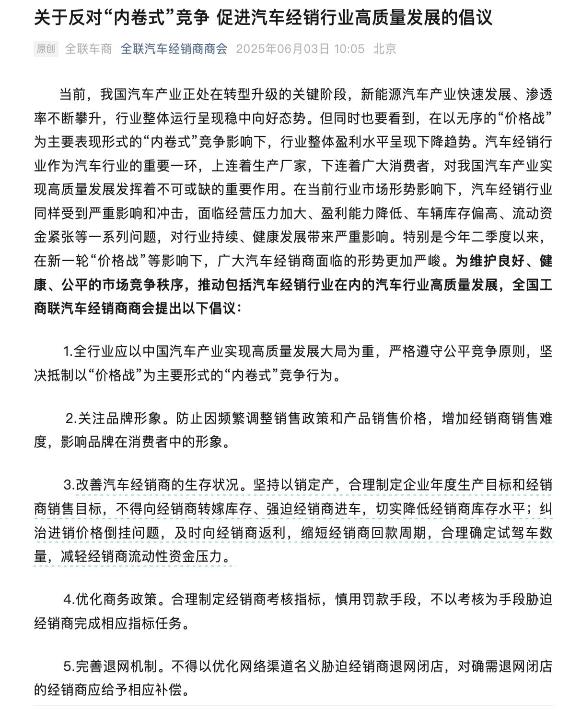 全國(guó)工商聯(lián)汽車(chē)經(jīng)銷(xiāo)商會(huì)發(fā)布“反內(nèi)卷”倡議