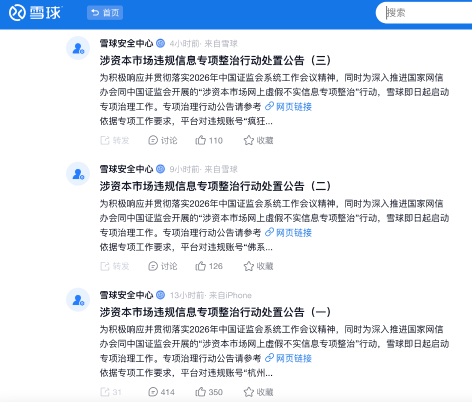 1月19日,雪球安全中心發(fā)布關(guān)于深入開(kāi)展涉資本市場(chǎng)違規(guī)信息專(zhuān)項(xiàng)整治的公告。雪球此次重點(diǎn)整治四類(lèi)違規(guī)行為:一是過(guò)度炒作、誘導(dǎo)跟風(fēng)交易乃至操縱市場(chǎng)的違規(guī)行為:二是非法證券投資咨詢(xún)及違規(guī)導(dǎo)流;三是網(wǎng)絡(luò)黑灰產(chǎn)及團(tuán)伙化違規(guī)操作;四是編造傳播虛假不實(shí)信息。