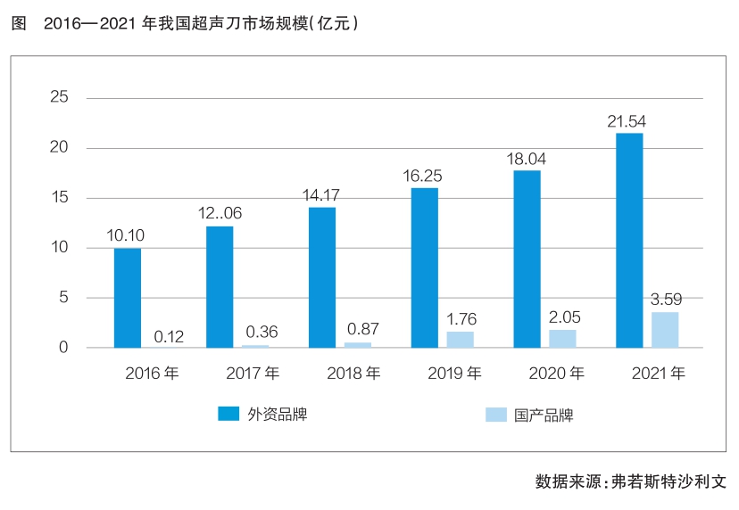 弗若斯特沙利文數(shù)據(jù)還顯示,我國(guó)超聲刀市場(chǎng)規(guī)模已從2016年的10.22億元增長(zhǎng)至2021年的25.13億元,年復(fù)合增長(zhǎng)率高達(dá)19.71%;其中,國(guó)產(chǎn)品牌市場(chǎng)規(guī)模增速較快,已從2016年的0.12億元增長(zhǎng)至2021年的3.59億元(詳見(jiàn)圖)。