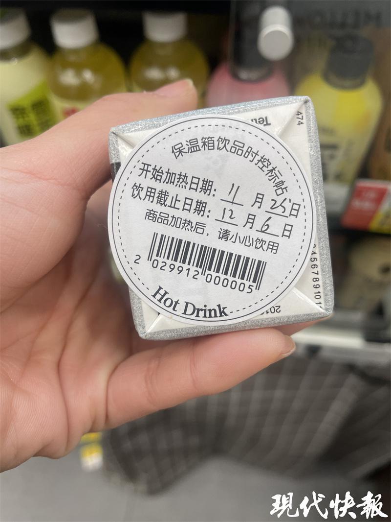 放在暖柜中的飲料,安全飲用期限最受關(guān)注。在走訪中,現(xiàn)代快報記者注意到,大部分放置在便利店暖柜中的飲料,都會加貼一張產(chǎn)品標簽。這份產(chǎn)品標簽叫作保溫箱飲品時控標貼,包含了飲品的開始加熱日期和飲用截止日期。按照飲品類別的不同,飲品時控的天數(shù)也不一樣。但是幾乎所有飲品在經(jīng)過加熱保溫處理后的保質(zhì)期,都比常溫狀態(tài)下的保質(zhì)期縮短了不少。以一款常溫狀態(tài)下保質(zhì)期為 9 個月的飲品為例,它在暖柜中經(jīng)過加熱后,僅有 14 天的賞味期。