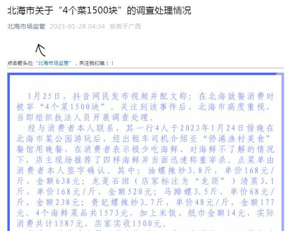 1月28日,廣西北海市市場監(jiān)督管理局微信公眾號發(fā)布《北海市關(guān)于“4個菜1500塊”的調(diào)查處理情況》,其中提到: