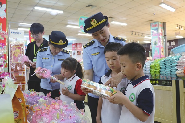 圖為該局執(zhí)法人員邀請(qǐng)小學(xué)生志愿者一起走進(jìn)超市,全程參與抽檢活動(dòng)。