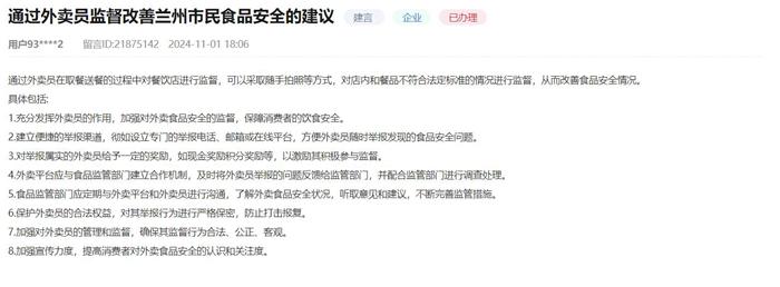 對于網(wǎng)友建議,蘭州市市場監(jiān)管局作出積極回應:“目前,消費者和外賣配送人員等可通過12315電話熱線、全國12315平臺微信小程序APP及全國12315平臺網(wǎng)站等及時反映食品安全問題。我們將聯(lián)合相關外賣平臺出臺鼓勵外賣配送人員積極履行食品安全監(jiān)督職責的機制和具體措施,鼓勵其通過照片、視頻等方式留存證據(jù),加強對外賣食品安全的監(jiān)督,市場監(jiān)管部門將按照相關法律法規(guī)等要求對各類食品安全違法線索和舉報進行核查處置。對于舉報屬實的,一方面按照《甘肅省食品安全舉報獎勵辦法》相關要求給予獎勵;另一方面我們也將聯(lián)合相關外賣平臺進一步研究制定具體的獎勵方案,如以積分獎勵等形式,激發(fā)外賣員參與監(jiān)督的熱情,形成良性監(jiān)督激勵機制。”