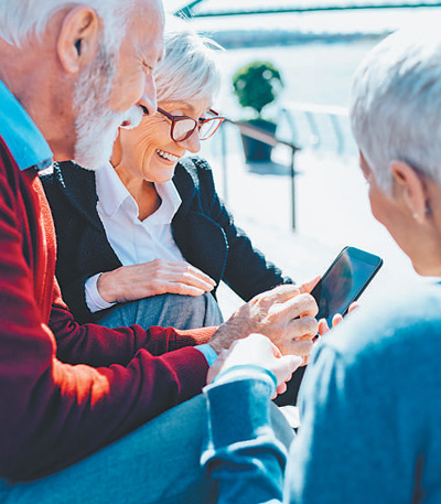 塞爾維亞三位老人在戶外交流學習使用智能手機經(jīng)驗。 |