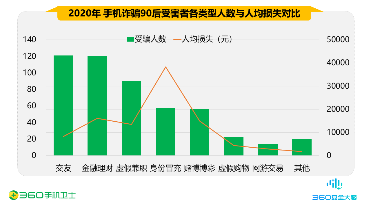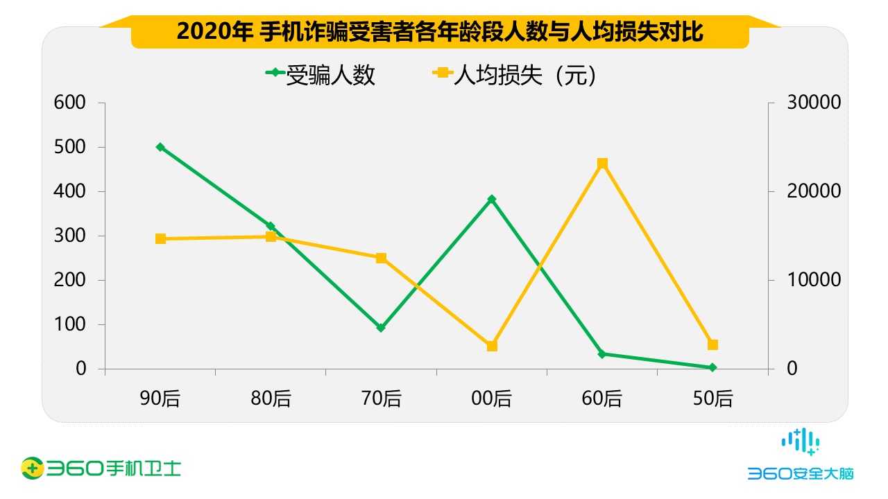 《2020年中國(guó)手機(jī)安全狀況報(bào)告》顯示,在網(wǎng)絡(luò)詐騙舉報(bào)用戶(hù)中,90后的手機(jī)詐騙受害者占所有受害者總數(shù)的37.5%,是不法分子從事網(wǎng)絡(luò)詐騙的主要受眾人群;其次是00后,占比為28.7%;80后占比為24.1%。而在人們印象中更容易遭受手機(jī)詐騙的70后和60后人群,僅占比不到10%。