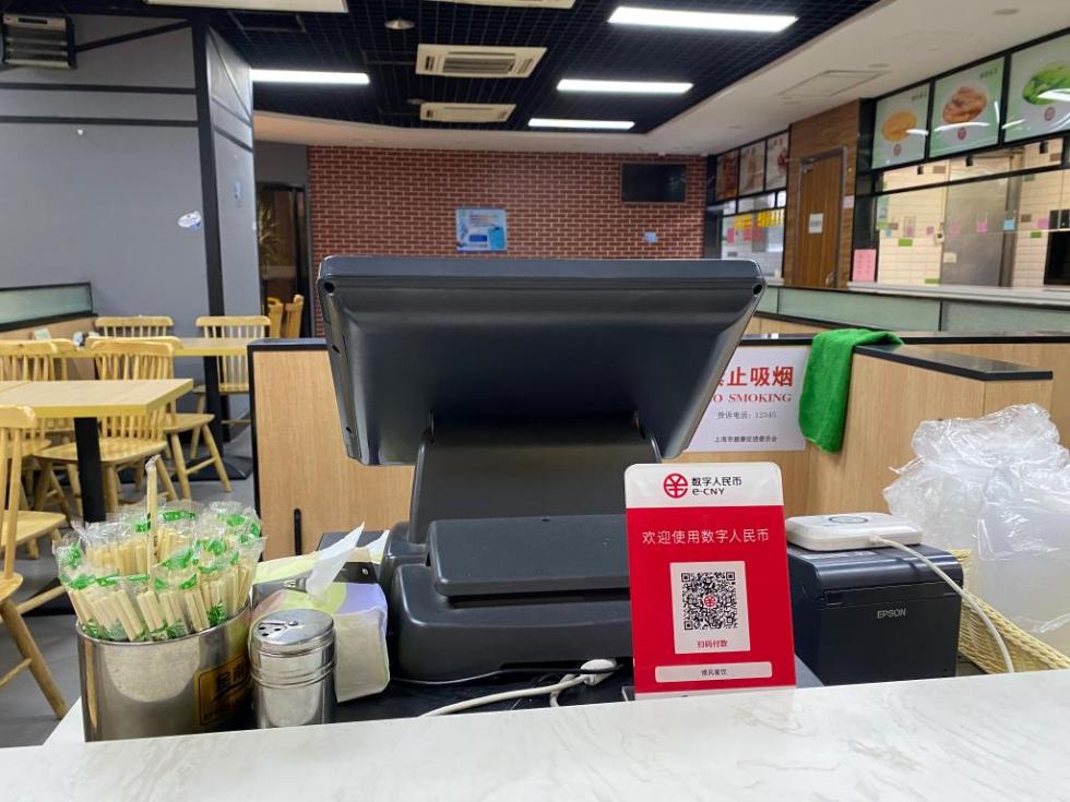 上海靜安區(qū)博風(fēng)白領(lǐng)食堂的收銀臺(tái)上也擺放著一塊“數(shù)字人民幣”標(biāo)牌,在這里吃飯的顧客可以便捷地使用這種新型支付方式。