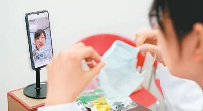 在上海市黃浦區(qū)打浦橋街道社區(qū)衛(wèi)生服務(wù)中心,家庭醫(yī)生在直播中與居民就戴口罩的問題進行互動。新華社記者 劉 穎攝