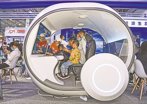 5月27日,孩子們在“數(shù)博會”上通過虛擬電動車體驗綠色出行。