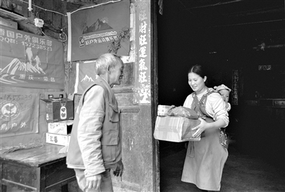 2020年下半年,漢源郵政在古路村設(shè)立了村郵站,村民通過電商平臺購物變得更加方便,村里的花椒、核桃、臘肉等土特產(chǎn)品也拓寬了銷售渠道。圖為郵政代辦員向開強(qiáng)(左)把包裹送到村民李娟家中。 記者 江宏景 攝
