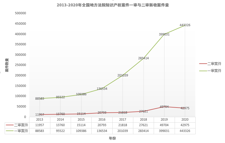 根據最高人民法院各年度知識產權司法保護白皮書(2013-2020年)的公開數據,本報告總結了這八年的總體收案情況(表一)??傮w而言,全國地方法院知識產權案件一審與二審新收案件量均呈現逐年遞增趨勢,其中一審新收案件量從2013年的88583件,增長至2020年的443326件,增長約4倍;二審新收案件量從2013年的11957件,增長至2020年的42975件,增長約2.6倍。此外,一審案件數量增幅明顯大于二審案件數量,一定程度上反映了我國一審案件審判質效逐步提高,多數知識產權案件在一審階段得到解決。