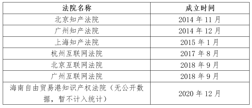 在設立時間上,知識產權專門法院要早于互聯網專門法院,6家專門法院的設立時間如表五。