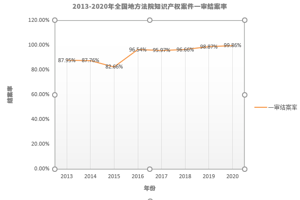 根據最高人民法院各年度知識產權司法保護白皮書(2013-2020年)公布的全國地方法院知識產權案件一審案件數和結案數,計算得出全國地方法院知識產權案件一審結案率(表三)。