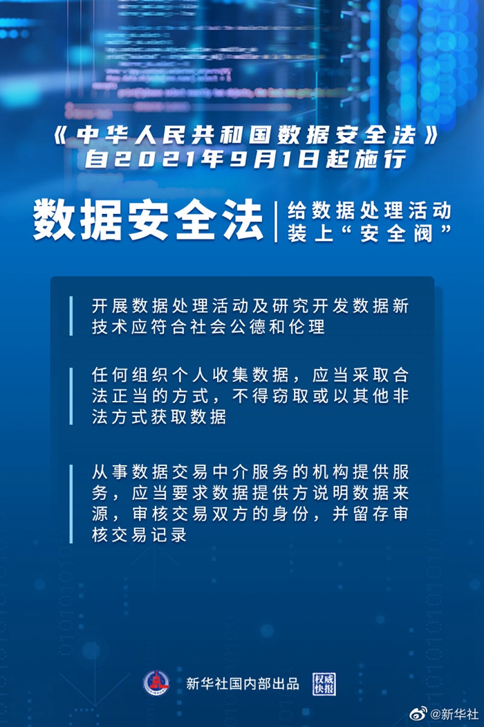 個人數(shù)據(jù)被不法分子竊取、買賣的問題咋破解?數(shù)據(jù)安全法自9月1日起施行,明確:①國家建立數(shù)據(jù)分類分級保護制度。②開展數(shù)據(jù)處理活動以及研究開發(fā)數(shù)據(jù)新技術(shù),應當有利于促進經(jīng)濟社會發(fā)展,增進人民福祉,符合社會公德和倫理。③國家建立健全數(shù)據(jù)交易管理制度,規(guī)范數(shù)據(jù)交易行為,培育數(shù)據(jù)交易市場。④不得竊取或以其他非法方式獲取數(shù)據(jù);數(shù)據(jù)交易中介服務(wù)機構(gòu)應要求數(shù)據(jù)提供方說明數(shù)據(jù)來源、審核交易雙方身份。⑤國家機關(guān)應建立健全數(shù)據(jù)安全管理制度,保障政務(wù)數(shù)據(jù)安全。愈加嚴密的法律體系,讓你我“觸網(wǎng)”無憂!(記者白陽,海報設(shè)計楊軼群)
