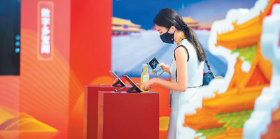 在由故宮博物院主辦、騰訊協(xié)辦的“文化傳承·數(shù)字共享”數(shù)字故宮體驗(yàn)專(zhuān)區(qū),推出了“數(shù)字文物”“數(shù)字考古”“數(shù)字服務(wù)”三大板塊,全方位展示了故宮20多年來(lái)的數(shù)字化成果。圖為9月1日,國(guó)家會(huì)議中心展館內(nèi),與會(huì)人員在體驗(yàn)故宮博物院的創(chuàng)意設(shè)備。 |