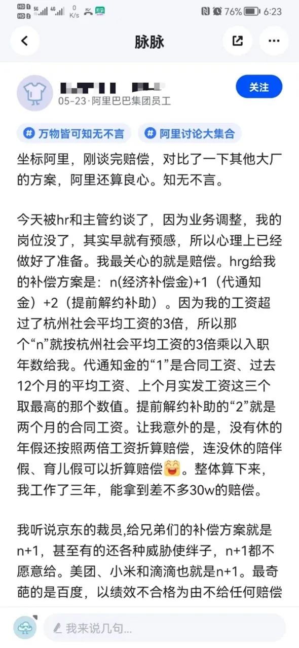 有阿里員工發(fā)文稱,“今天被約談了,這周五走N+3,緩沖29天是N+1,去年的校招生,目前手里沒offer,正在面試”。該員工還糾結(jié)是再待一個月還是拿n+3走人。還有員工發(fā)文證實(shí)阿里裁員N+3,并稱和之前流傳消息不同的是,最后期限提前到周三以及沒有次月社保。