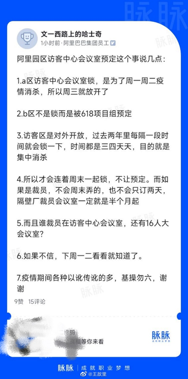 針對上述爆料,另一阿里員工當(dāng)天在脈脈發(fā)布長文回應(yīng)稱,A區(qū)訪客中心會議室被鎖是為了疫情消殺,B區(qū)是被618項(xiàng)目組預(yù)定,訪客區(qū)是對外開放的,過去兩年里每隔一段時間就會因集中消殺而封鎖,時間都是三四天。