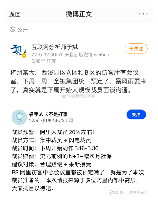 隨后,認(rèn)證為阿里巴巴員工的一名脈脈用戶發(fā)布“裁員預(yù)警”,其稱阿里將大裁員20%左右,裁員賠償是史無前例的N+3并贈次月社保。該員工也透露,“阿里訪客中心的會議室都被預(yù)定滿了,就是為了本次裁員準(zhǔn)備的,本次情報來源于多位阿里內(nèi)部中高層?!?/p>