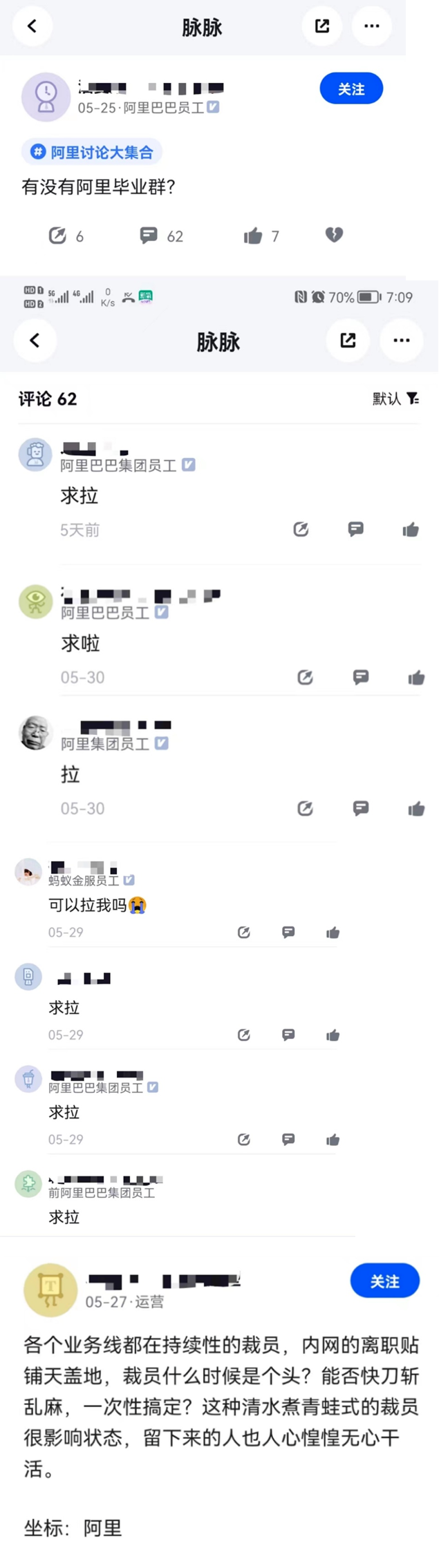 脈脈上一條“有沒有阿里畢業(yè)群”的職言下,60余條的評論基本都是“求拉”,其中,大部分評論者認(rèn)證為阿里巴巴員工。還有員工發(fā)文吐槽“這種溫水煮青蛙式的裁員很影響狀態(tài),留下來的人也人心惶惶無心干活”。