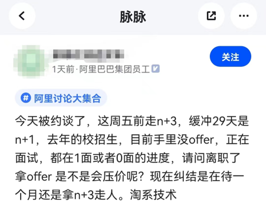 有阿里員工發(fā)文稱,“今天被約談了,這周五走N+3,緩沖29天是N+1,去年的校招生,目前手里沒offer,正在面試”。該員工還糾結(jié)是再待一個月還是拿n+3走人。還有員工發(fā)文證實阿里裁員N+3,并稱和之前流傳消息不同的是,最后期限提前到周三以及沒有次月社保。