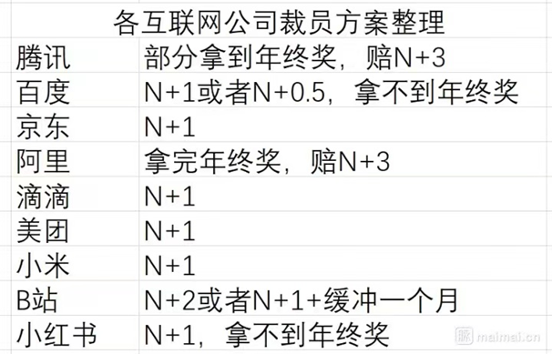 該員工還曬出一份“各互聯(lián)網(wǎng)公司裁員方案整理”的表格,根據(jù)該表,相比其它幾家大廠,阿里的“拿完年終獎,賠N+3”方案如該員工所說“還算良心”。