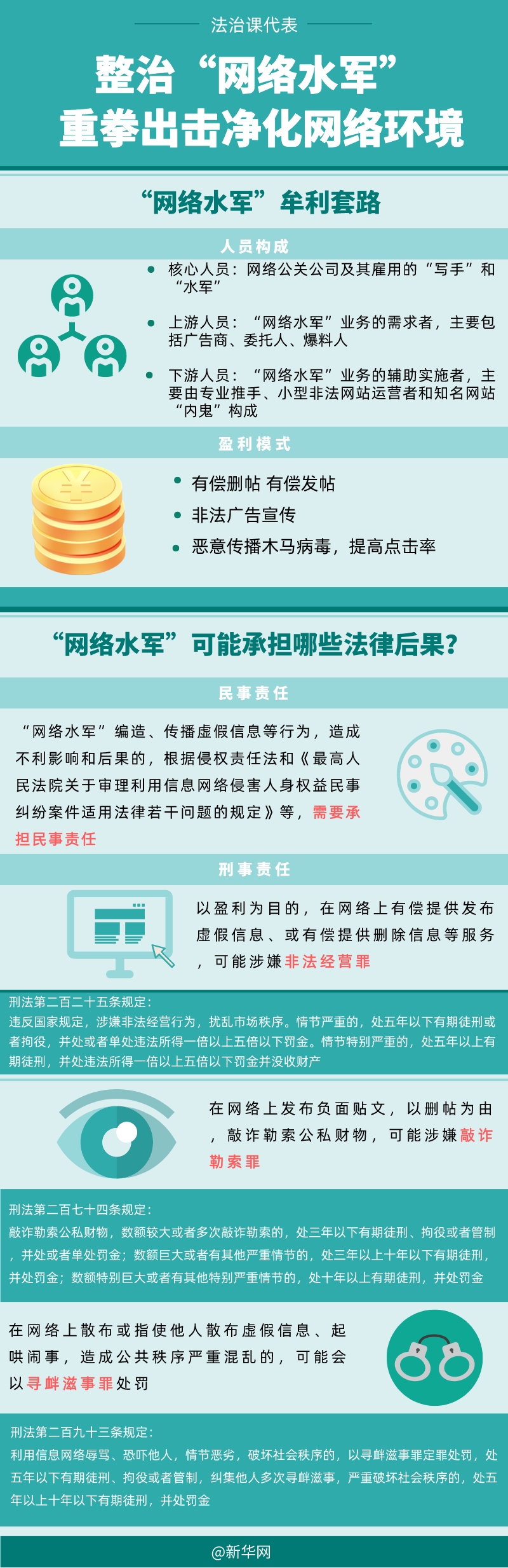 6月27日,公安部網(wǎng)安局在全國(guó)范圍內(nèi)啟動(dòng)為期6個(gè)月的依法打擊整治“網(wǎng)絡(luò)水軍”專項(xiàng)工作?!熬W(wǎng)絡(luò)水軍”的牟利套路有哪些?可能承擔(dān)哪些法律后果?一圖帶你了解一下!