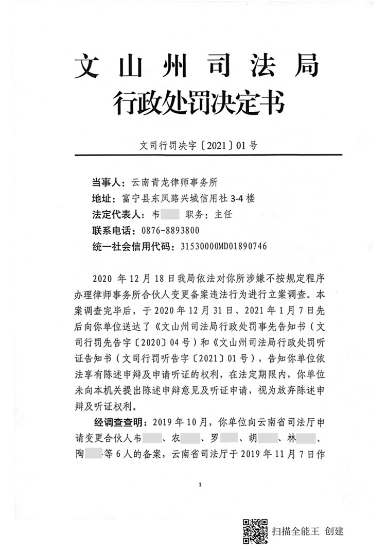 云南青龍律師事務(wù)所因不按照規(guī)定辦理律師事務(wù)所合伙人變更被處警告
