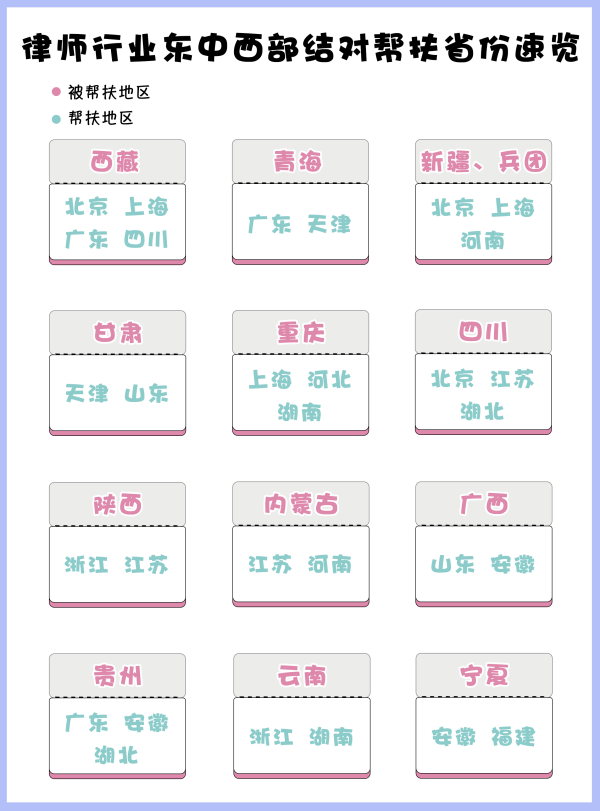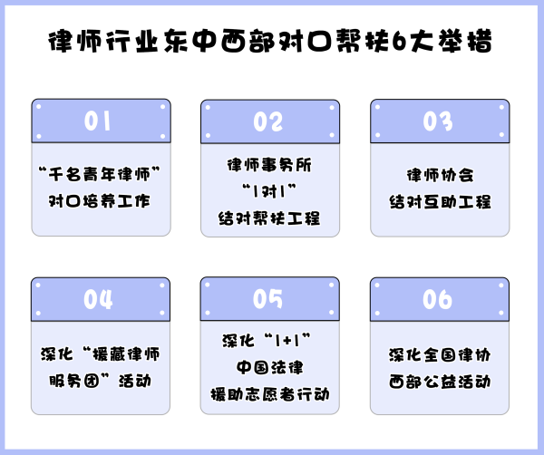 為有效推進律師行業(yè)東中西部對口幫扶工作,《關(guān)于建立健全律師行業(yè)東中西部對口幫扶機制的方案》列舉了如下措施。