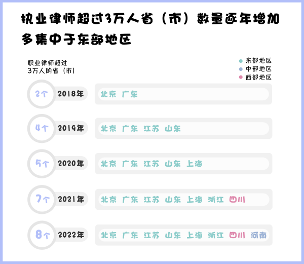 從司法部發(fā)布的數(shù)據(jù)來看,近五年來,律師人數(shù)超過3萬人的省(市)數(shù)量持續(xù)上漲,截至2022年底,共有8個?。ㄊ校┑穆蓭熑藬?shù)超過3萬,其中除河南、四川外,其余省(市)均分布在東部地區(qū)。