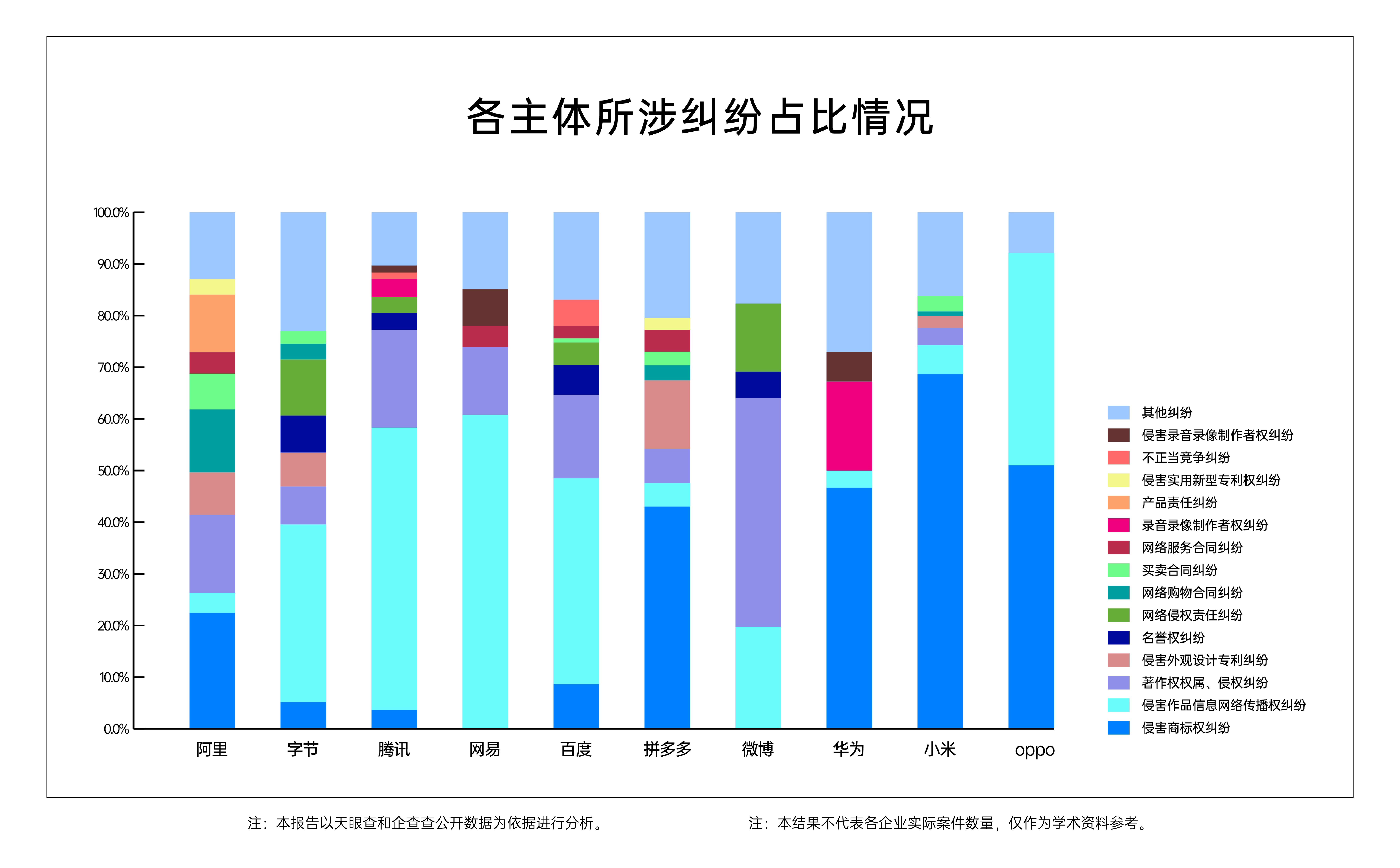 3.呈現(xiàn)高和解撤訴、中勝訴、低敗訴態(tài)勢:十家企業(yè)相關(guān)民事案件勝訴率在20%~40%左右,“其他和撤訴類別”的糾紛占比均處于較高水平,平均占比為54.54%。具體而言,微博平臺以75.64%最高;OPPO以75.04%的占比緊隨其后;拼多多與阿里的該項占比分別為63.48%和55.73%;騰訊、網(wǎng)易及字節(jié)三家企業(yè)依次為53.94%、52.98%和50.47%。整體呈現(xiàn),各主體勝訴率整體平均且未達高位,敗訴率普遍低位運行,和解撤訴率則顯著提升。